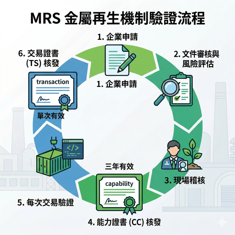 MRS 透過嚴謹的流程,確保再生含量的真實性與可追溯性。包含企業端的「能力證書 (CC)」與每次交易的「交易證書 (TS)」。新圖表清楚展示從申請到核發的六個關鍵步驟,強調嚴謹的稽核流程與證書有效期。
