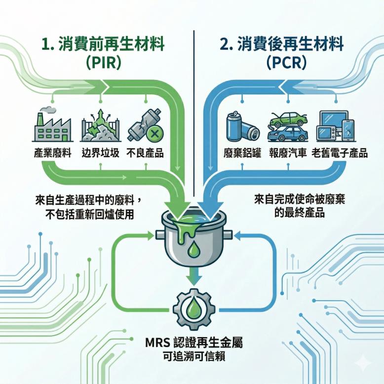 再生含量的準確計算取決於對 PIR (消費前再生) 與 PCR (消費後再生) 材料的嚴格區分。新圖表詳細定義並比較了這兩種來源:PIR 來自工廠廢料,而 PCR 來自完成使命被廢棄的最終產品(包含修正後的「老舊電子產品」標籤)。這對金屬產業的減碳績效至關重要。