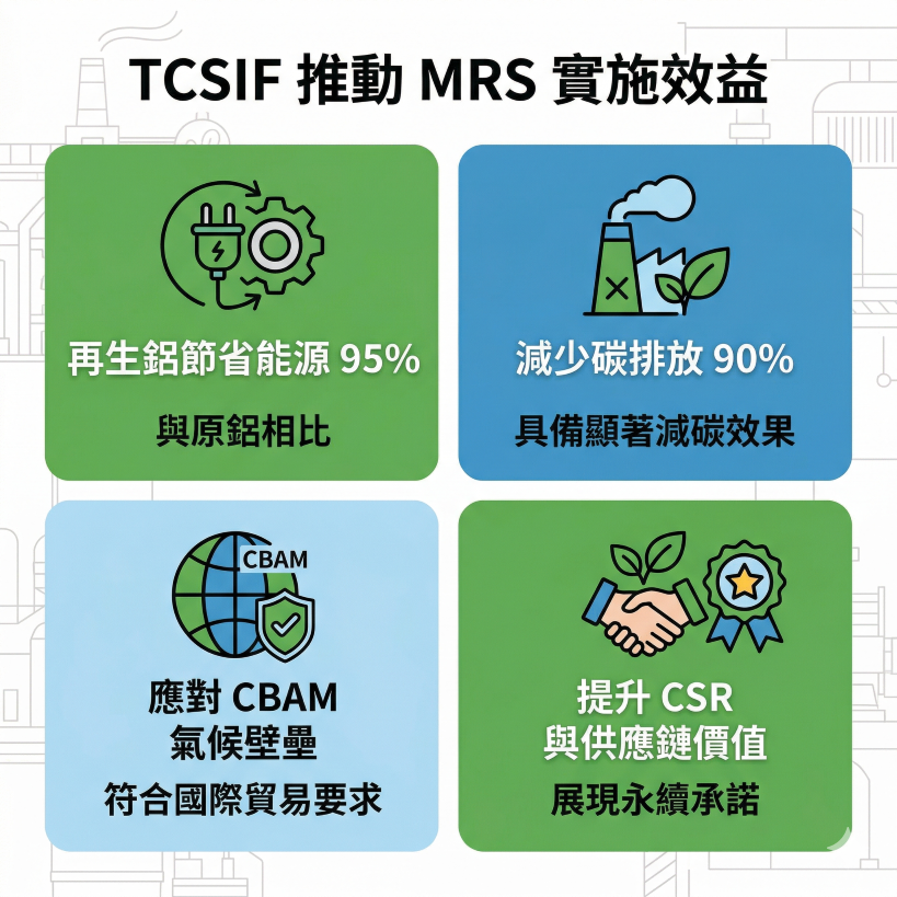 實施 MRS 不僅能為企業帶來實質的能源節省和碳排減少(如鋁業高達 95% 能源節省),還能提升 CSR 供應鏈價值,最重要的是協助企業應對如歐盟 CBAM 等國際貿易氣候壁壘。新圖表清晰展示了四大關鍵效益。
