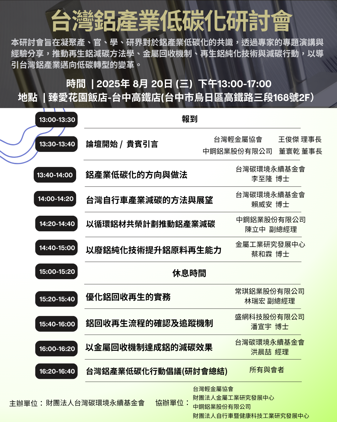 2025「台灣鋁產業低碳化研討會」8月20日台中登場
